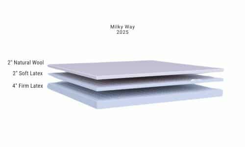 The Milky Way mattress is hand-built with a new 2025 design, featuring a soft comfort top and firm base support in a low-profile structure. It includes a 2” latex comfort layer made from GOLS-certified 100% natural organic latex (soft) and a 4” firm latex base for superior support. The breathable wool top is crafted from natural New Zealand wool, enhancing temperature regulation in all seasons.